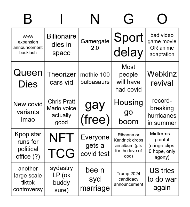 This bingo card has a free space and 24 words: NFT TCG, sydastry LP (ok buddy sure), mothie 100 bulbasaurs, another large scale tiktok controversy, bad video game movie OR anime adaptation, WoW expansion announcement backlash, Queen Dies, Billionaire dies in space, Housing go boom, Everyone gets a covid test, Most people will have had covid, New covid variants lmao, Rihanna or Kendrick drops an album (pls for the love of god), Midterms = painful (cringe clips, 0 hope, only agony), Theorizer cars vid, Trump 2024 candidacy announcement, record-breaking hurricanes in summer, Gamergate 2.0, Webkinz revival, Chris Pratt Mario voice actually good, US tries to do war again, Kpop star runs for political office (?), Sport delay and bee n syd marriage.