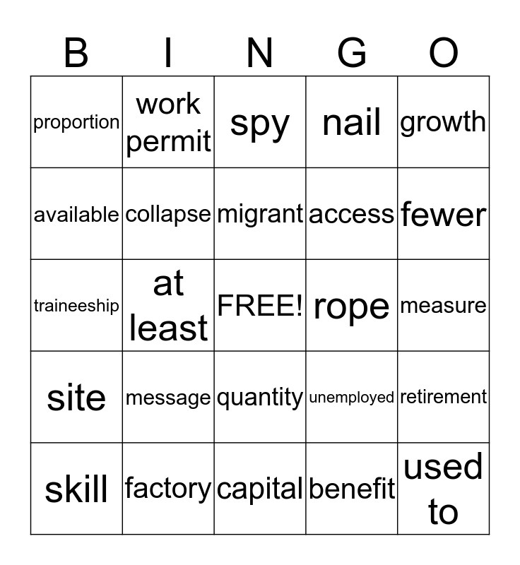 This bingo card has a free space and 66 words: applicant, shift, application, retirement, earn, employees, work permit, region, migrant, jobcentre, quantity, reduce, measure, growth, few, available, at least, proportion, reasonable, access, message, site, nail, attach, wage, sack, experience, vacancy, used to, require, skill, firm, company, ability, unemployed, factory, qualified, traineeship, benefit, job interview, collapse, enormous, rope, sufficient, overweight, figure, fewer, about, approximately, main, mainly, add, completely, underestimate, lap, snail, commerce, wire, spy, capital, delete, data, drop, drag, erase and reality.