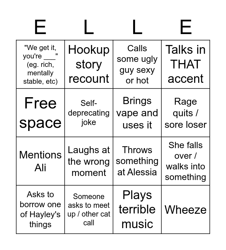 This bingo card has 16 words: Someone asks to meet up / other cat call, She falls over / walks into something, Calls some ugly guy sexy or hot, "We get it, you're ___" (eg. rich, mentally stable, etc), Mentions Ali, Hookup story recount, Throws something at Alessia, Plays terrible music, Free space, Self-deprecating joke, Asks to borrow one of Hayley's things, Talks in THAT accent, Laughs at the wrong moment, Rage quits / sore loser, Brings vape and uses it and Wheeze.