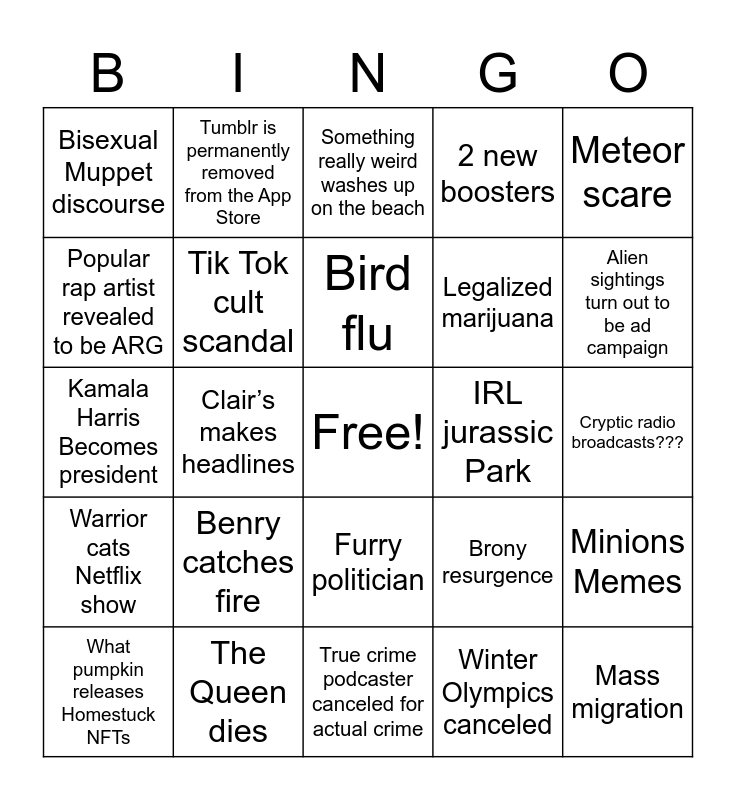 This bingo card has a free space and 24 words: Benry catches fire, The Queen dies, Bird flu, What pumpkin releases Homestuck NFTs, Meteor scare, Bisexual Muppet discourse, Popular rap artist revealed to be ARG, Tumblr is permanently removed from the App Store, IRL jurassic Park, Furry politician, Legalized marijuana, Kamala Harris Becomes president, Brony resurgence, Minions Memes, Tik Tok cult scandal, Winter Olympics canceled, Cryptic radio broadcasts???, Something really weird washes up on the beach, Alien sightings turn out to be ad campaign, Clair’s makes headlines, Mass migration, Warrior cats Netflix show, 2 new boosters and True crime podcaster canceled for actual crime.