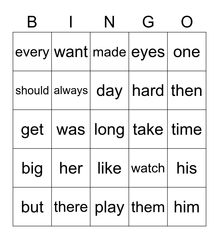 This bingo card has 25 words: her, play, day, but, one, every, should, want, take, like, hard, get, watch, his, always, him, time, made, then, was, long, there, big, eyes and them.