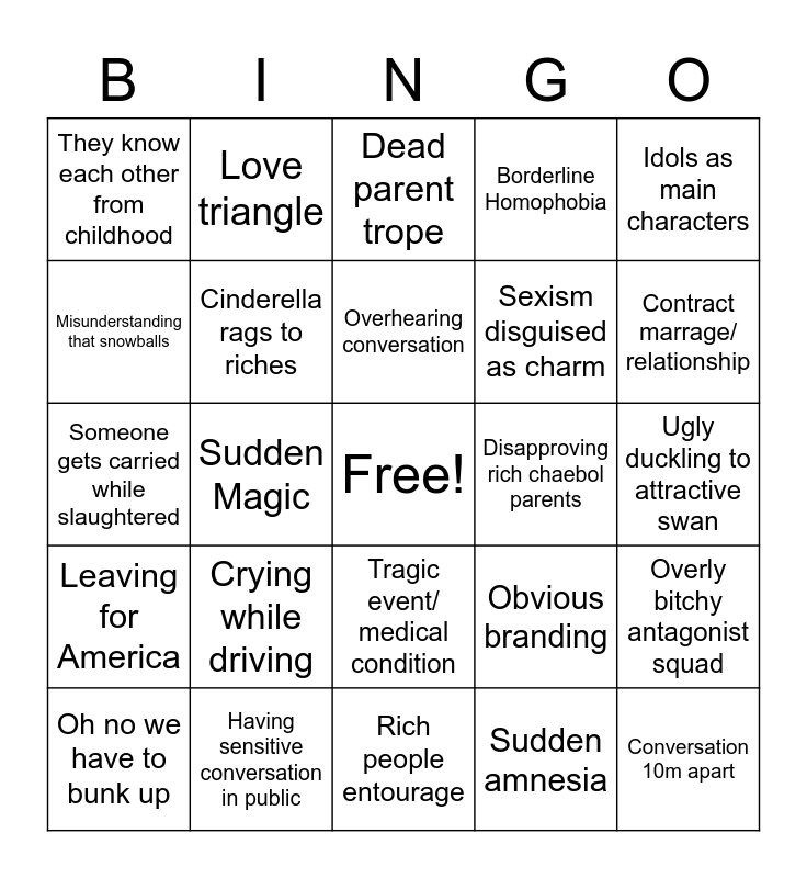 This bingo card has a free space and 24 words: Crying while driving, Having sensitive conversation in public, Overhearing conversation, Oh no we have to bunk up, Idols as main characters, They know each other from childhood, Misunderstanding that snowballs, Love triangle, Disapproving rich chaebol parents, Tragic event/ medical condition, Sexism disguised as charm, Someone gets carried while slaughtered, Obvious branding, Overly bitchy antagonist squad, Cinderella rags to riches, Sudden amnesia, Ugly duckling to attractive swan, Dead parent trope, Contract marrage/ relationship, Sudden Magic, Conversation 10m apart, Leaving for America, Borderline Homophobia and Rich people entourage.