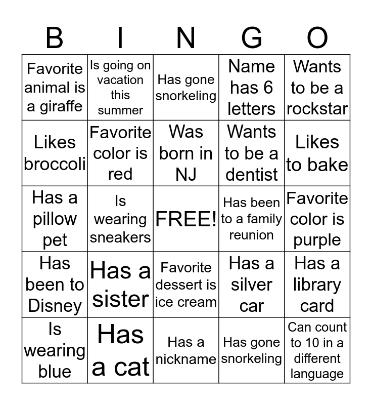 This bingo card has a free space and 24 words: Has a sister, Has a cat, Was born in NJ, Is wearing blue, Wants to be a rockstar, Favorite animal is a giraffe, Likes broccoli, Is going on vacation this summer, Has been to a family reunion, Favorite dessert is ice cream, Wants to be a dentist, Has a pillow pet, Has a silver car, Has a library card, Favorite color is red, Has gone snorkeling, Favorite color is purple, Has gone snorkeling, Likes to bake, Is wearing sneakers, Can count to 10 in a different language, Has been to Disney, Name has 6 letters and Has a nickname.