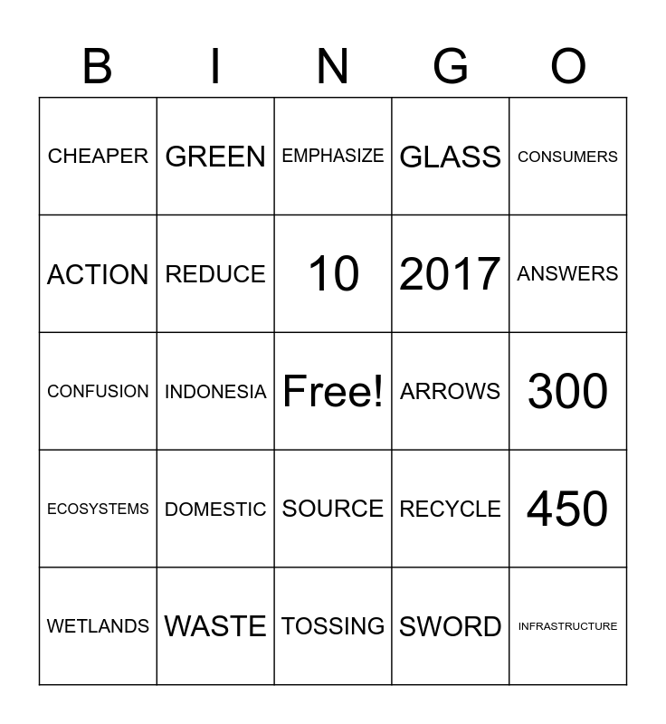 This bingo card has a free space and 29 words: WETLANDS, HARMFUL, INDONESIA, 75%, CHEAPER, EMPHASIZE, REDUCE, DOMESTIC, ARROWS, WASTE, 300, INFRASTRUCTURE, TOSSING, SWORD, ANSWERS, ACCUMULATION, SOURCE, ECOSYSTEMS, CONSUMERS, CONFUSION, RECYCLE, CROSSROADS, 2017, ACTION, GLASS, GREEN, 450, 10 and FUTURE.