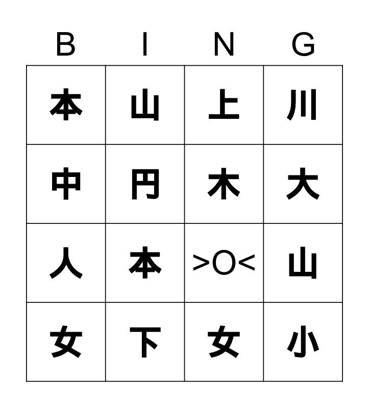 This bingo card has 21 words: 下, 中, 山, 子, 女, 木, 本, 上, >O<, 大, 人, 川, 小, 男, 円, 花, 女, 本, 中, 山 and 大.