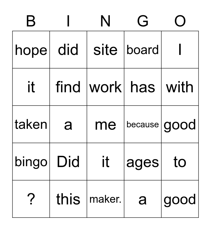 This bingo card has a free space and 24 words: Did, this, work, ?, I, hope, it, did, because, it, has, taken, ages, to, find, a, good, site, with, a, good, bingo, board and maker..