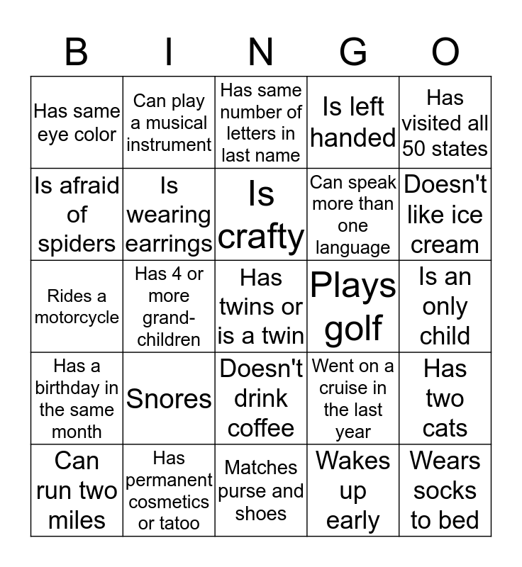This bingo card has 25 words: Snores, Matches purse and shoes, Is crafty, Can run two miles, Has visited all 50 states, Has same eye color, Is afraid of spiders, Can play a musical instrument, Plays golf, Doesn't drink coffee, Can speak more than one language, Rides a motorcycle, Went on a cruise in the last year, Has two cats, Is wearing earrings, Wears socks to bed, Is an only child, Has same number of letters in last name, Doesn't like ice cream, Has 4 or more grand-children, Has twins or is a twin, Has permanent cosmetics or tatoo, Has a birthday in the same month, Is left handed and Wakes up early.