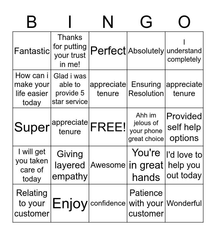This bingo card has a free space and 24 words: Giving layered empathy, Enjoy, appreciate tenure, Relating to your customer, I understand completely, Fantastic, How can i make your life easier today, Thanks for putting your trust in me!, Ahh im jelous of your phone great choice, Awesome, Ensuring Resolution, Super, You're in great hands, I'd love to help you out today, Glad i was able to provide 5 star service, Patience with your customer, Provided self help options, Perfect, appreciate tenure, appreciate tenure, Wonderful, I will get you taken care of today, Absolutely and confidence.
