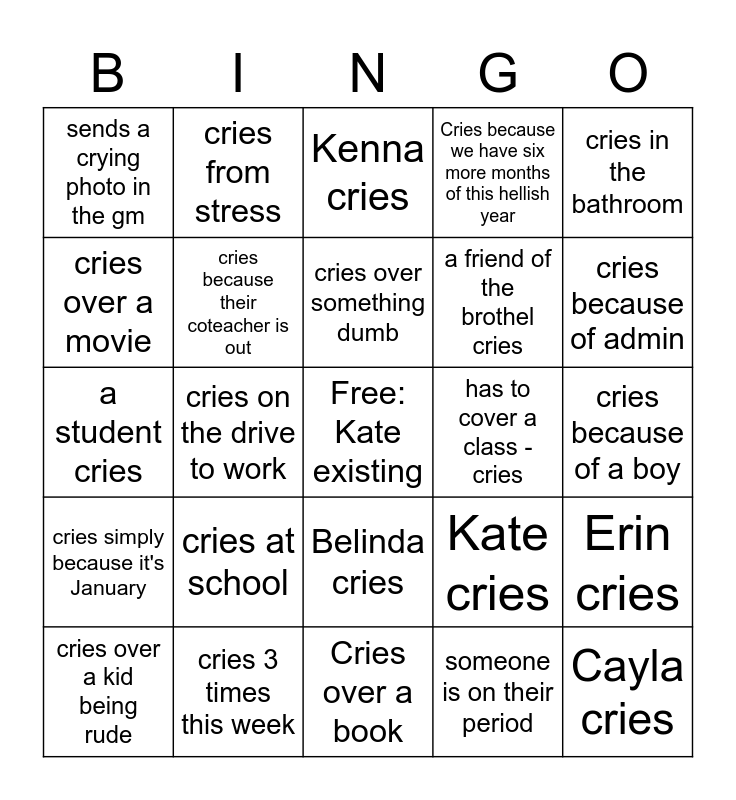 This bingo card has a free space and 24 words: cries at school, cries 3 times this week, cries over something dumb, cries over a kid being rude, cries in the bathroom, sends a crying photo in the gm, cries over a movie, cries from stress, has to cover a class - cries, Belinda cries, a friend of the brothel cries, a student cries, Kate cries, Erin cries, cries because their coteacher is out, someone is on their period, cries because of a boy, Kenna cries, cries because of admin, cries on the drive to work, Cayla cries, cries simply because it's January, Cries because we have six more months of this hellish year and Cries over a book.
