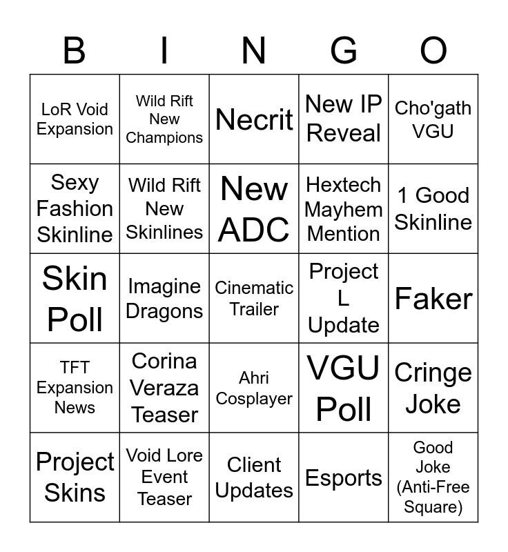 This bingo card has a free space and 24 words: Corina Veraza Teaser, Void Lore Event Teaser, New ADC, Project Skins, Cho'gath VGU, LoR Void Expansion, Sexy Fashion Skinline, Wild Rift New Champions, Project L Update, Ahri Cosplayer, Hextech Mayhem Mention, Skin Poll, VGU Poll, Cringe Joke, Wild Rift New Skinlines, Esports, Faker, Necrit, 1 Good Skinline, Imagine Dragons, Good Joke (Anti-Free Square), TFT Expansion News, New IP Reveal and Client Updates.