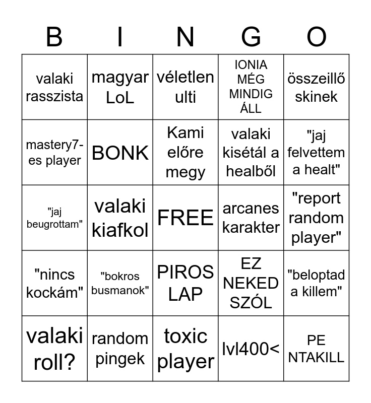 This bingo card has a free space and 24 words: "bokros busmanok", random pingek, Kami előre megy, valaki roll?, összeillő skinek, valaki rasszista, mastery7-es player, magyar LoL, arcanes karakter, PIROS LAP, valaki kisétál a healből, "jaj beugrottam", EZ NEKED SZÓL, "beloptad a killem", BONK, lvl400<, "report random player", véletlen ulti, "jaj felvettem a healt", valaki kiafkol, PE NTAKILL, "nincs kockám", IONIA MÉG MINDIG ÁLL and toxic player.