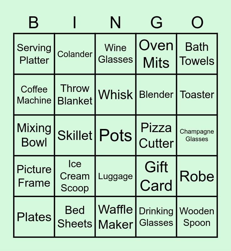 This bingo card has 43 words: Free!, Pots, Pans, Plates, Silverware, Drinking Glasses, Wine Glasses, Vacuum, Bath Towels, Bed Sheets, Oven Mits, Pizza Cutter, Luggage, Ice Cream Scoop, KitchenAid Mixer, Waffle Maker, Food Processor, Mixing Bowl, Wok, Toaster, Colander, Knives, Cookie Sheet, Serving Platter, Bowls, Champagne Glasses, Air Fryer, Rolling Pin, Gift Card, Picture Frame, Pillows, Robe, Coasters, Skillet, Cutting Board, Measuring Cups, Wooden Spoon, Whisk, Coffee Machine, Blender, Mug, Throw Blanket and Storage Container.