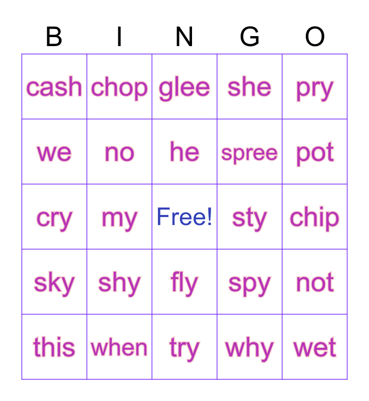 This bingo card has a free space and 24 words: shy, when, he, this, pry, cash, we, chop, sty, fly, spree, cry, spy, not, no, why, chip, glee, pot, my, wet, sky, she and try.