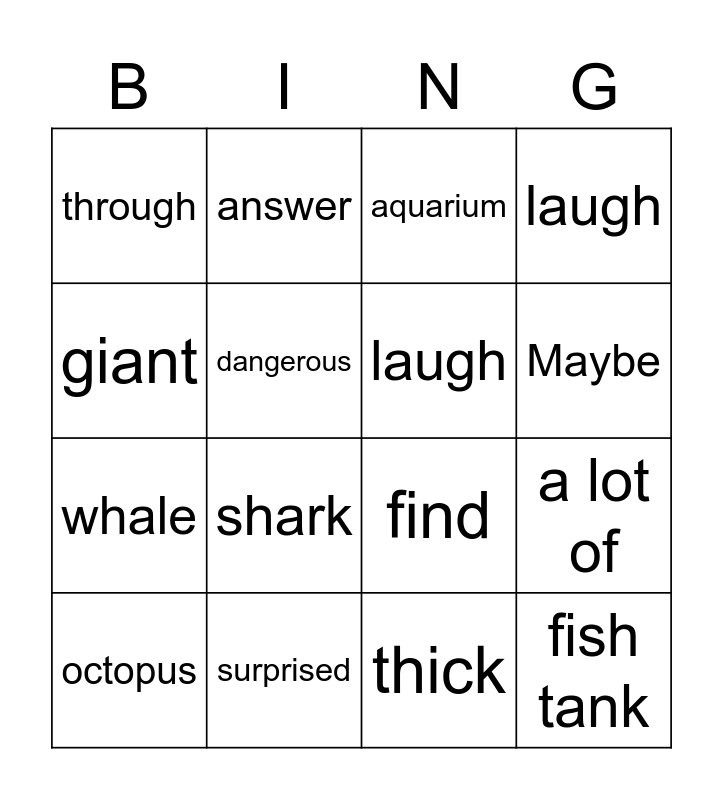 This bingo card has 19 words: find, fun, aquarium, fish tank, a lot of, giant, thick, through, answer, whale, shark, dangerous, laugh, surprised, octopus, arms, laugh, Maybe and squid.