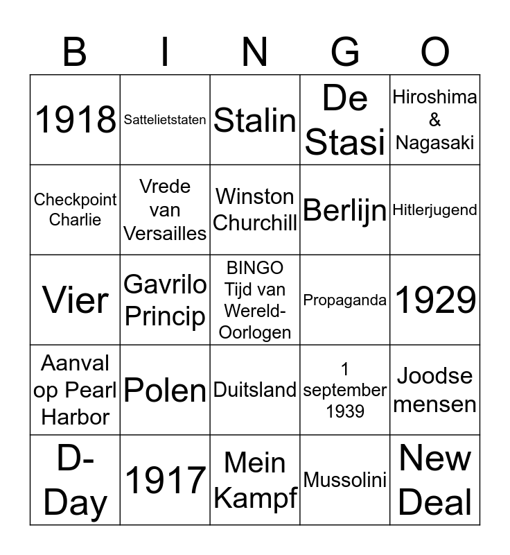 This bingo card has a free space and 30 words: 1917, Tsaar NicolaasII, Gavrilo Princip, Sarajevo, 1918, Stalin, Vrede van Versailles, Duitsland, Propaganda, Mein Kampf, 1929, New Deal, Mussolini, Hitler, Hitlerjugend, Appeasement-politiek, 1 september 1939, Aanval op Pearl Harbor, Polen, Hiroshima & Nagasaki, Vier, IJzeren Gordijn, Sattelietstaten, Berlijn, Checkpoint Charlie, De Stasi, Joodse mensen, D-Day, Winston Churchill and 5 mei 1945.
