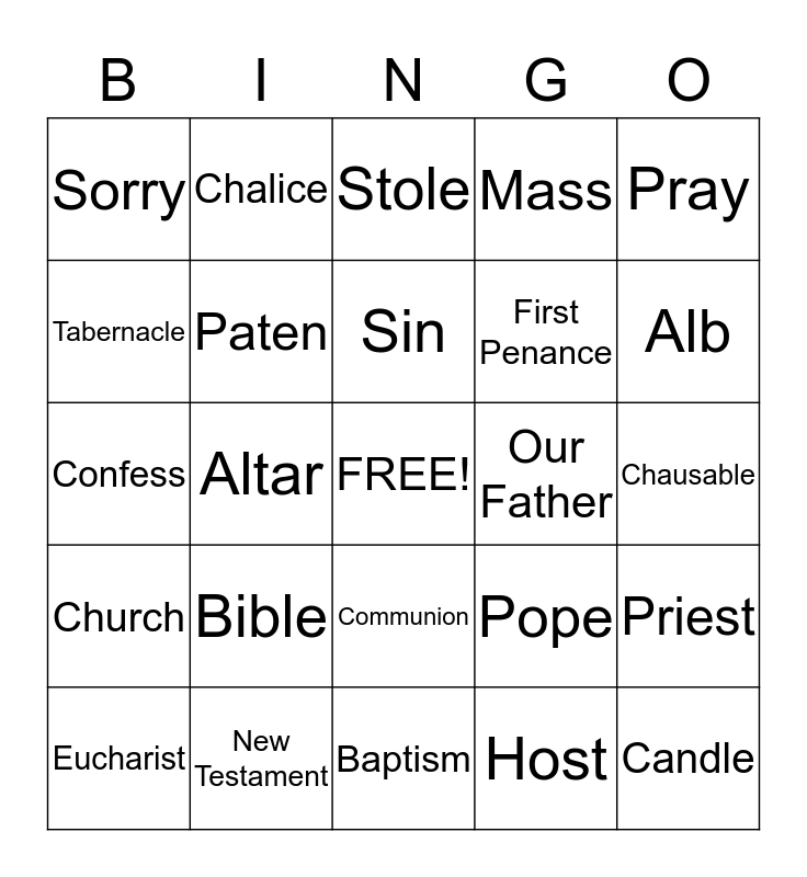 This bingo card has a free space and 24 words: Bible, New Testament, Sin, Eucharist, Pray, Sorry, Tabernacle, Chalice, Our Father, Communion, First Penance, Confess, Pope, Priest, Paten, Host, Chausable, Stole, Alb, Altar, Candle, Church, Mass and Baptism.