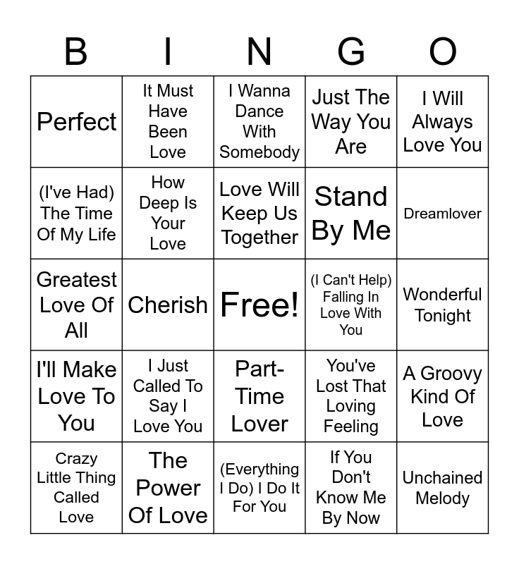 This bingo card has a free space and 33 words: Can't Help Falling in Love, Chapel Of Love, Cherish, Endless Love, I'll Make Love To You, How Deep Is Your Love, I Will Always Love You, Crazy Little Thing Called Love, It Must Have Been Love, Crazy In Love, Love Will Keep Us Together, I Wanna Dance With Somebody, What's Love Got To Do With It, I Want To Know What love Is, (I Can't Help) Falling In Love With You, Dreamlover, The Power Of Love, Greatest Love Of All, I Just Called To Say I Love You, You've Lost That Loving Feeling, Part-Time Lover, Hopelessly Devoted To You, Perfect, Wonderful Tonight, (Everything I Do) I Do It For You, Unchained Melody, Just The Way You Are, Stand By Me, (I've Had) The Time Of My Life, A Groovy Kind Of Love, L-O-V-E, If You Don't Know Me By Now and All Of Me.