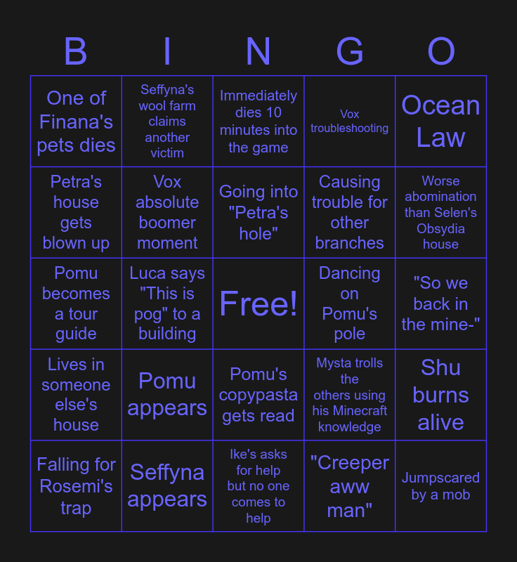 This bingo card has a free space and 24 words: Pomu appears, Seffyna appears, Going into "Petra's hole", Falling for Rosemi's trap, Ocean Law, One of Finana's pets dies, Petra's house gets blown up, Seffyna's wool farm claims another victim, Dancing on Pomu's pole, Pomu's copypasta gets read, Causing trouble for other branches, Pomu becomes a tour guide, Mysta trolls the others using his Minecraft knowledge, Shu burns alive, Vox absolute boomer moment, "Creeper aww man", "So we back in the mine-", Immediately dies 10 minutes into the game, Worse abomination than Selen's Obsydia house, Luca says "This is pog" to a building, Jumpscared by a mob, Lives in someone else's house, Vox troubleshooting and Ike's asks for help but no one comes to help.