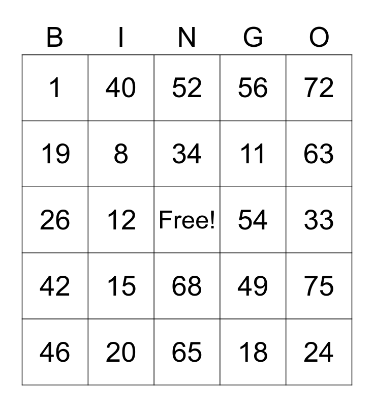 This bingo card has a free space and 24 words: 15, 20, 34, 46, 72, 1, 19, 40, 54, 68, 11, 26, 49, 75, 8, 18, 33, 52, 63, 12, 24, 42, 56 and 65.