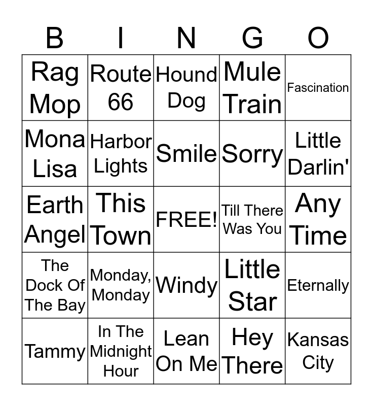 This bingo card has a free space and 75 words: Blue Velvet, Release Me, Hound Dog, All Shook Up, One Night, Blue Hawaii, Too Much, Little Sister, Guitar Man, Love Me, Stuck On You, (Let Me Be Your) Teddy Bear, Smile, Mona Lisa, Ramblin' Rose, This Town, Somethin' Stupid, Kansas City, Honey-comb, Fascination, Unchained Melody, Earth Angel, Harbor Lights, Route 66, Mule Train, Que Sera, Sera, Slowpoke, Because Of You, Mr. Sandman, Chantilly Lace, Love Is Strange, Diana, 26 Miles, Little Star, Little Darlin', Sorry, Don't You Know, Marianne, Any Time, Hey There, I Beleive, Shrimp Boats, Wanted, Cry, Be My Love, Hot Diggity, Tammy, Rag Mop, Calendar Girl, Sherry, Charlie Brown, Windy, Cherish, Wild Thing, Yakety Yak, Winchester Cathedral, Love Me Do, This Boy, Spanish Eyes, Downtown, Monday, Monday, Michelle, Yesterday, Something, When I'm Sixty Four, Till There Was You, And I Love Her, Personality, Secret Love, Eternally, The Dock Of The Bay, In The Midnight Hour, The Letter, Lean On Me and Wichita Lineman.