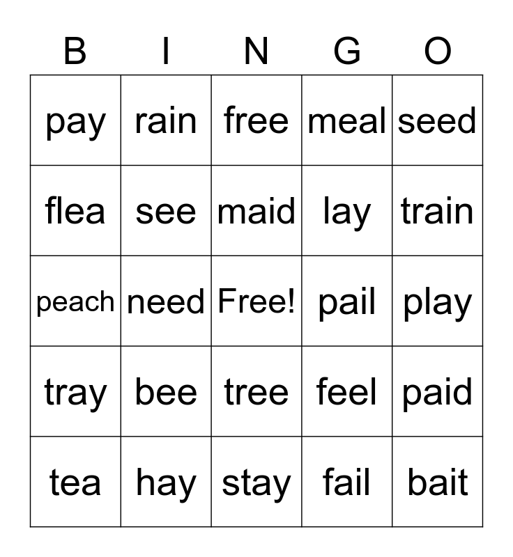 This bingo card has a free space and 24 words: bee, hay, maid, tea, seed, pay, flea, rain, pail, tree, lay, peach, feel, paid, see, fail, play, free, train, need, bait, tray, meal and stay.