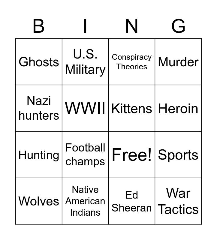 This bingo card has 22 words: Native American Indians, Survivor stories, U.S. Military, Coal and Oil, WWII, Kittens, Ghosts, Conspiracy Theories, Free!, War Tactics, Hunting, Murder, Art, The 50's, Ed Sheeran, Spiders, Sports, Wolves, Football champs, Nazi hunters, Heroin and Dirt bikes.