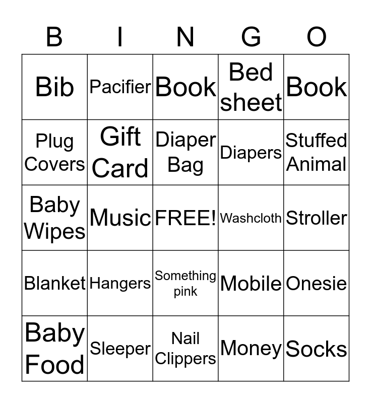 This bingo card has a free space and 24 words: Hangers, Sleeper, Diaper Bag, Baby Food, Book, Bib, Plug Covers, Pacifier, Washcloth, Something pink, Diapers, Baby Wipes, Mobile, Onesie, Gift Card, Money, Stroller, Book, Stuffed Animal, Music, Socks, Blanket, Bed sheet and Nail Clippers.