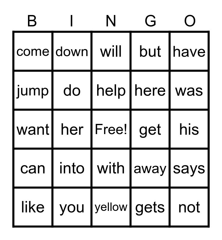 This bingo card has a free space and 24 words: into, you, help, like, have, come, jump, down, get, with, here, want, away, says, do, gets, his, will, was, her, not, can, but and yellow.