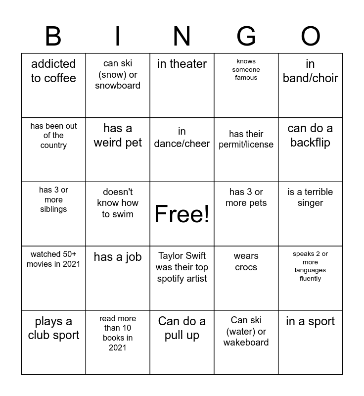 This bingo card has a free space and 24 words: has a job, read more than 10 books in 2021, in dance/cheer, plays a club sport, in band/choir, addicted to coffee, has been out of the country, can ski (snow) or snowboard, has 3 or more pets, Taylor Swift was their top spotify artist, has their permit/license, has 3 or more siblings, wears crocs, speaks 2 or more languages fluently, has a weird pet, Can ski (water) or wakeboard, is a terrible singer, in theater, can do a backflip, doesn't know how to swim, in a sport, watched 50+ movies in 2021, knows someone famous and Can do a pull up.