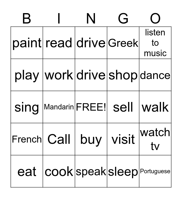 This bingo card has a free space and 24 words: Call, cook, drive, eat, listen to music, paint, play, read, sell, buy, shop, sing, visit, watch tv, work, sleep, walk, drive, dance, Mandarin, Portuguese, French, Greek and speak.
