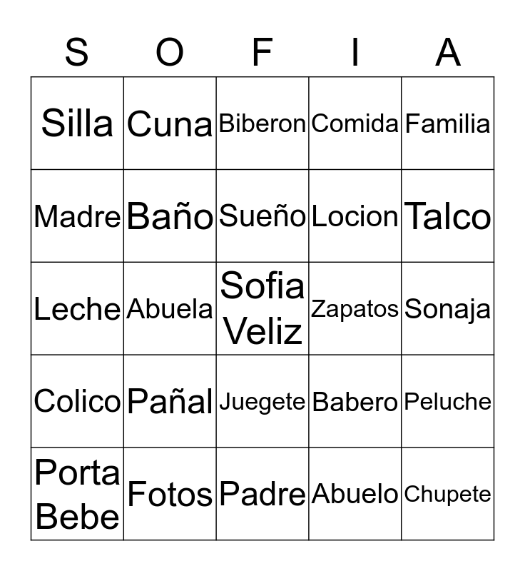 This bingo card has a free space and 27 words: Babero, Llorar, Locion, Padre, Madre, Biberon, Cuna, Colico, Zapatos, Peluche, Leche, Comida, Porta Bebe, Fotos, Talco, Botella, Baño, Sueño, Pañal, Silla, Sonaja, Abuelo, Abuela, Chupete, Juegete, Familia and Hermano.