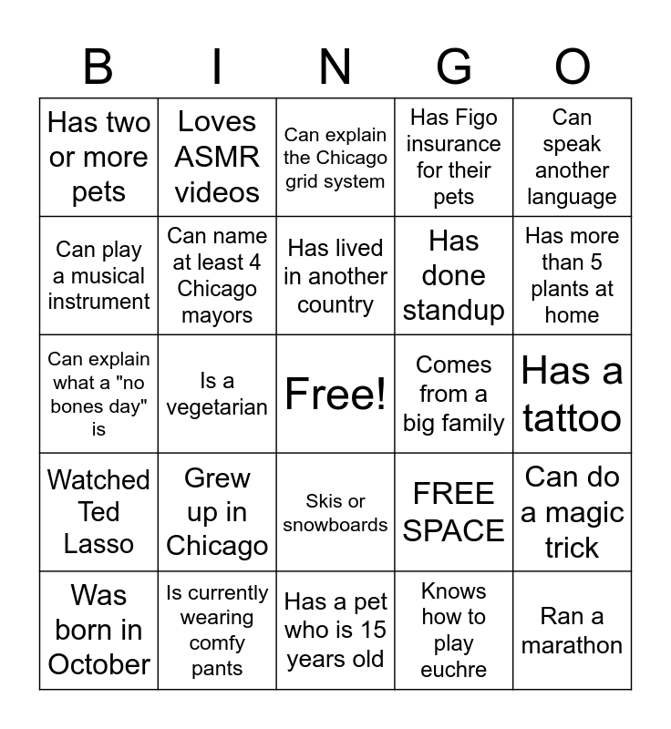 This bingo card has a free space and 25 words: Grew up in Chicago, Has a pet who is 15 years old, Has lived in another country, Was born in October, Can speak another language, Has two or more pets, Can play a musical instrument, Loves ASMR videos, Comes from a big family, Skis or snowboards, Has done standup, Can explain what a "no bones day" is, FREE SPACE, Can do a magic trick, Can name at least 4 Chicago mayors, Has gone viral on Twitter, Has a tattoo, Can explain the Chicago grid system, Has more than 5 plants at home, Is a vegetarian, Ran a marathon, Is currently wearing comfy pants, Watched Ted Lasso, Has Figo insurance for their pets and Knows how to play euchre.