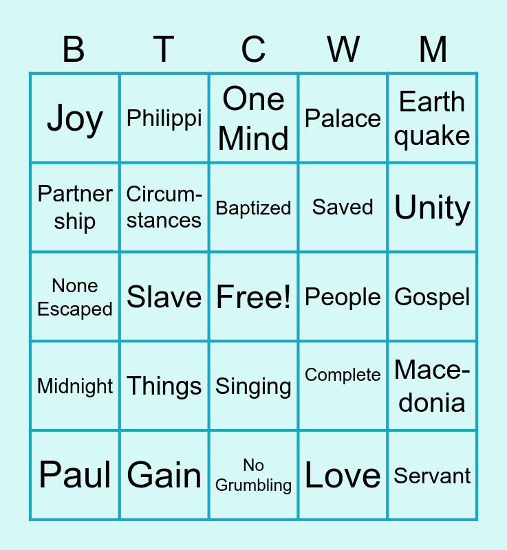 This bingo card has a free space and 29 words: Paul, Lydia, Slave, Timothy, Joy, One Mind, Circum- stances, Things, People, Gain, Gospel, Servant, No Grumbling, Love, Unity, Silas, Singing, Midnight, Earth quake, None Escaped, Complete, Chains, Saved, Partner ship, Palace, Philippi, Mace- donia, Baptized and Hospi- tality.