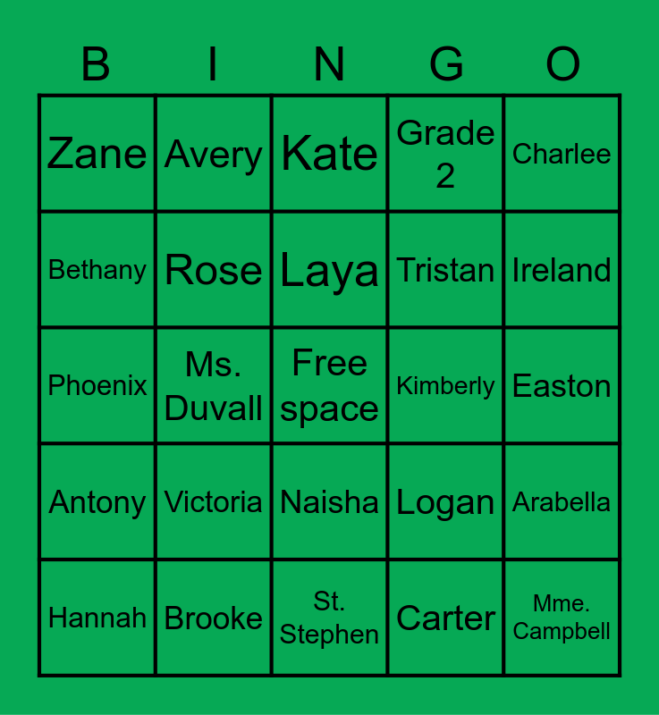 This bingo card has a free space and 24 words: Victoria, Brooke, Laya, Hannah, Charlee, Zane, Bethany, Avery, Kimberly, Naisha, Tristan, Phoenix, Logan, Arabella, Rose, Carter, Easton, Kate, Ireland, Ms. Duvall, Mme. Campbell, Antony, Grade 2 and St. Stephen.