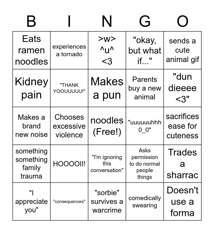This bingo card has a free space and 24 words: HOOOOII!, "consequences", Makes a pun, "I appreciate you", sends a cute animal gif, Eats ramen noodles, Kidney pain, experiences a tornado, "uuuuuuhhh 0_0", "I'm ignoring this conversation", Parents buy a new animal, Makes a brand new noise, Asks permission to do normal people things, Trades a sharrac, "THANK YOOUUUUU!", comedically swearing, sacrifices ease for cuteness, >w> ^u^ <3, "dun dieeee <3", Chooses excessive violence, Doesn't use a forma, something something family trauma, "okay, but what if..." and "sorbie" survives a warcrime.