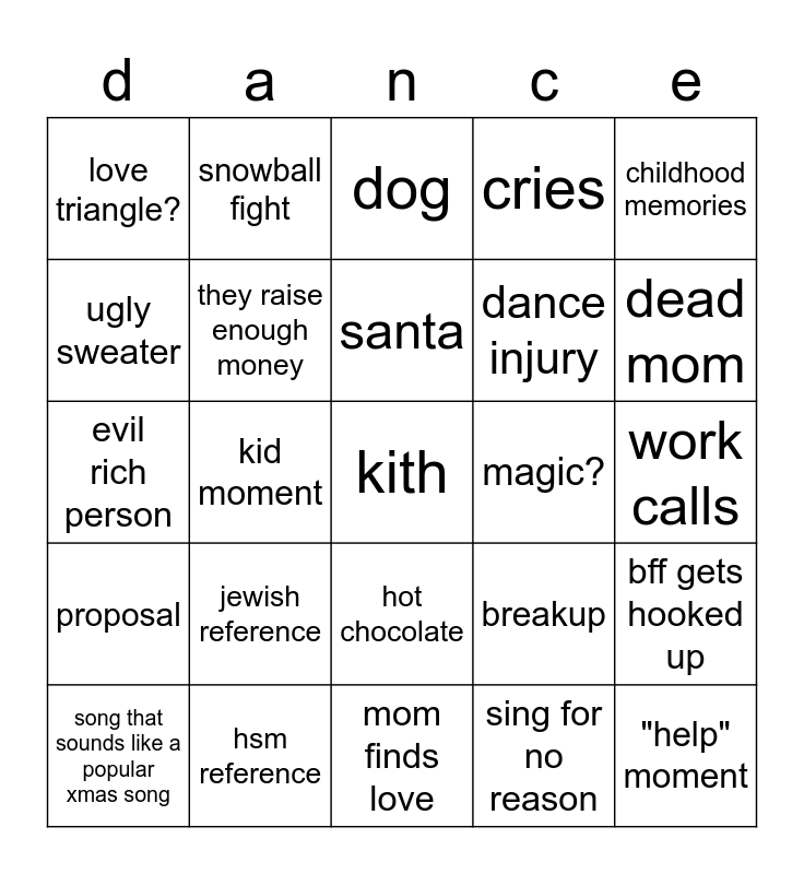 This bingo card has a free space and 24 words: jewish reference, hsm reference, santa, song that sounds like a popular xmas song, childhood memories, love triangle?, ugly sweater, snowball fight, magic?, hot chocolate, dance injury, evil rich person, breakup, bff gets hooked up, they raise enough money, sing for no reason, work calls, dog, dead mom, kid moment, "help" moment, proposal, cries and mom finds love.