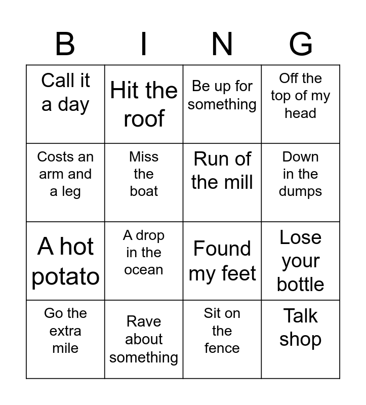 This bingo card has 16 words: Rave about something, Lose your bottle, Be up for something, Call it a day, A hot potato, Hit the roof, Found my feet, Sit on the fence, Costs an arm and a leg, Miss the boat, Go the extra mile, Off the top of my head, A drop in the ocean, Down in the dumps, Run of the mill and Talk shop.