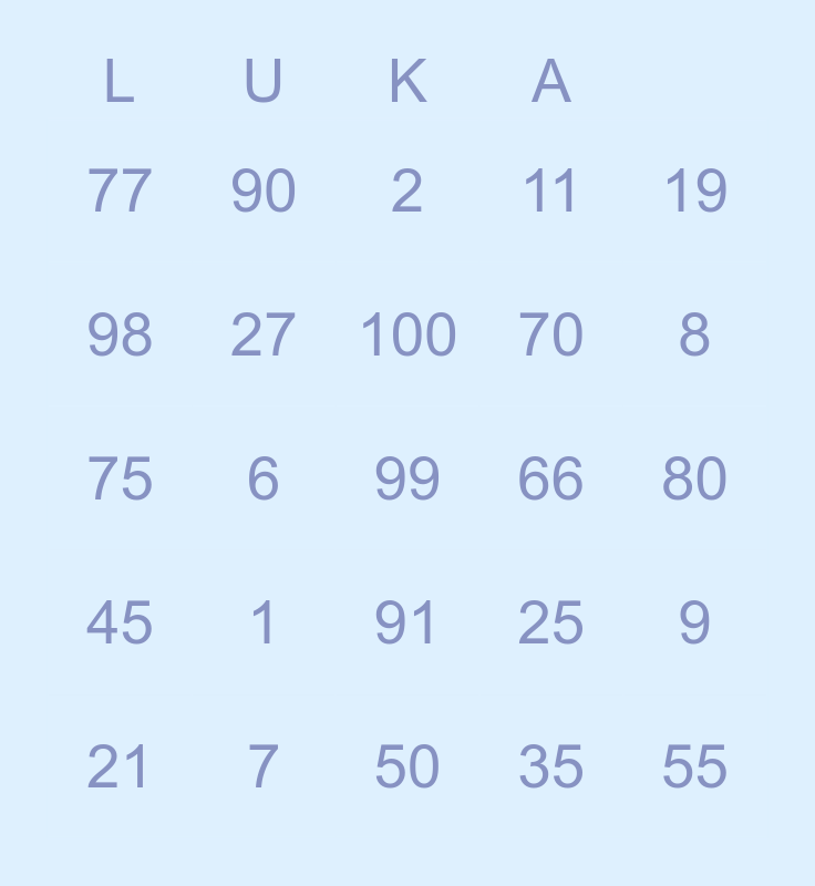 This bingo card has a free space and 24 words: 1, 7, 100, 21, 19, 77, 98, 90, 66, 91, 70, 75, 25, 9, 27, 35, 80, 2, 8, 6, 55, 45, 11 and 50.
