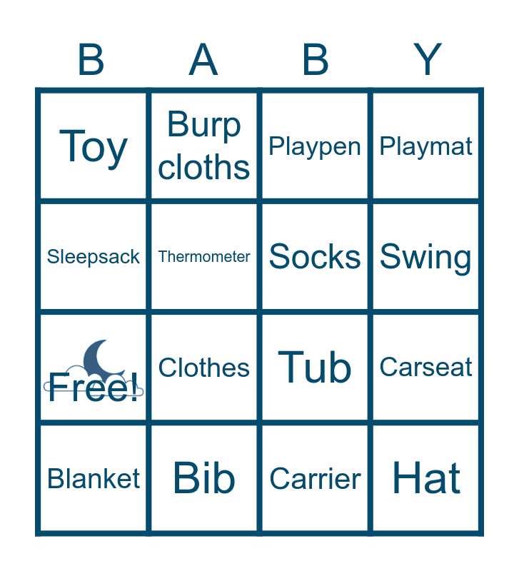 This bingo card has 1 images and 20 words: Carseat, Bassinet, Playpen, Bottles, Blanket, Sleepsack, Bib, Toy, Free!, Burp cloths, Clothes, Tub, Thermometer, Hat, Socks, Bouncer, Swing, Playmat, Carrier and Diaper Cream.