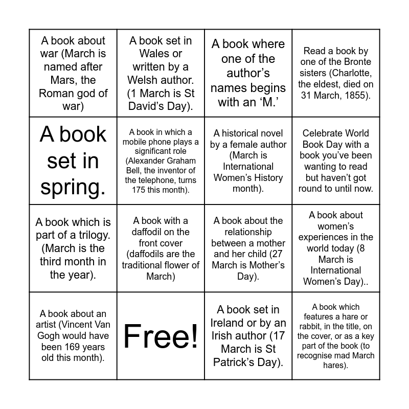 This bingo card has 16 words: Free!, A book about women’s experiences in the world today (8 March is International Women’s Day).., A book where one of the author’s names begins with an ‘M.’, A book about war (March is named after Mars, the Roman god of war), A book which is part of a trilogy. (March is the third month in the year)., A book set in Wales or written by a Welsh author. (1 March is St David’s Day)., A book about the relationship between a mother and her child (27 March is Mother’s Day)., A book set in Ireland or by an Irish author (17 March is St Patrick’s Day)., A book set in spring., A book in which a mobile phone plays a significant role (Alexander Graham Bell, the inventor of the telephone, turns 175 this month)., A book about an artist (Vincent Van Gogh would have been 169 years old this month)., Read a book by one of the Bronte sisters (Charlotte, the eldest, died on 31 March, 1855)., A book with a daffodil on the front cover (daffodils are the traditional flower of March), Celebrate World Book Day with a book you’ve been wanting to read but haven’t got round to until now., A historical novel by a female author (March is International Women’s History month). and A book which features a hare or rabbit, in the title, on the cover, or as a key part of the book (to recognise mad March hares)..