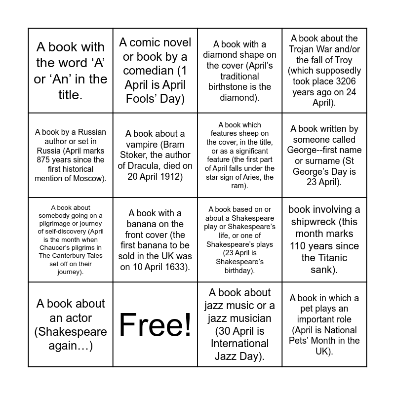 This bingo card has 16 words: Free!, book involving a shipwreck (this month marks 110 years since the Titanic sank)., A book with a diamond shape on the cover (April’s traditional birthstone is the diamond)., A book with the word ‘A’ or ‘An’ in the title., A book about somebody going on a pilgrimage or journey of self-discovery (April is the month when Chaucer’s pilgrims in The Canterbury Tales set off on their journey)., A comic novel or book by a comedian (1 April is April Fools’ Day), A book based on or about a Shakespeare play or Shakespeare’s life, or one of Shakespeare’s plays (23 April is Shakespeare’s birthday)., A book about jazz music or a jazz musician (30 April is International Jazz Day)., A book by a Russian author or set in Russia (April marks 875 years since the first historical mention of Moscow)., A book about a vampire (Bram Stoker, the author of Dracula, died on 20 April 1912), A book about an actor (Shakespeare again…), A book about the Trojan War and/or the fall of Troy (which supposedly took place 3206 years ago on 24 April)., A book with a banana on the front cover (the first banana to be sold in the UK was on 10 April 1633)., A book written by someone called George--first name or surname (St George’s Day is 23 April)., A book which features sheep on the cover, in the title, or as a significant feature (the first part of April falls under the star sign of Aries, the ram). and A book in which a pet plays an important role (April is National Pets’ Month in the UK)..