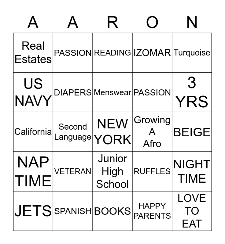 This bingo card has a free space and 24 words: VETERAN, SPANISH, Menswear, JETS, Turquoise, Real Estates, US NAVY, PASSION, Growing A Afro, Junior High School, PASSION, California, RUFFLES, NIGHT TIME, DIAPERS, HAPPY PARENTS, BEIGE, READING, 3 YRS, Second Language, LOVE TO EAT, NAP TIME, IZOMAR and BOOKS.