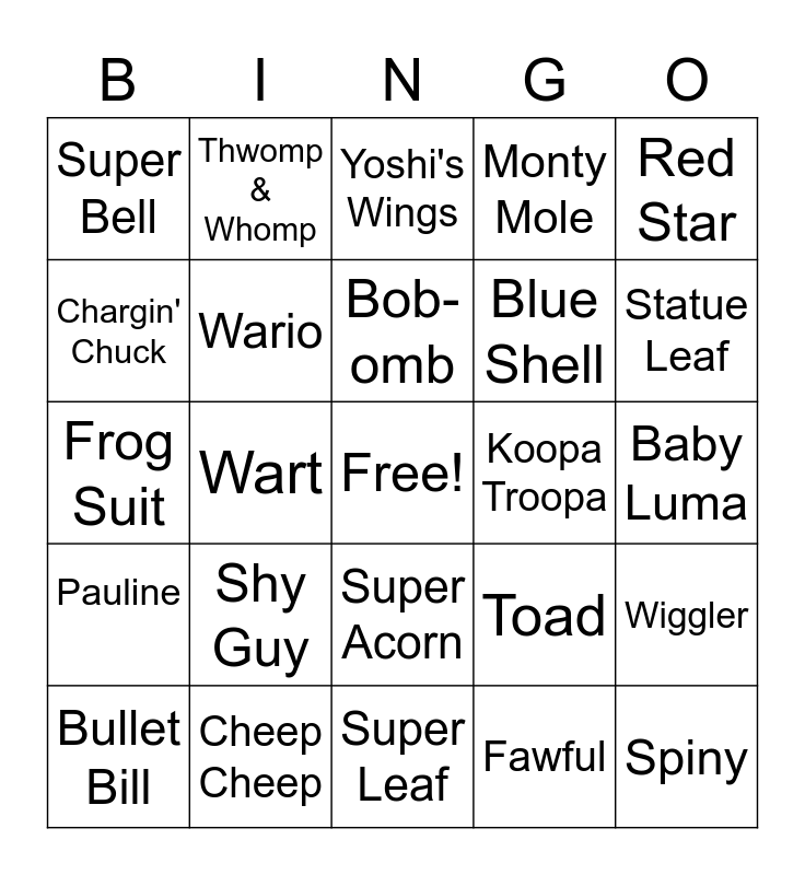 This bingo card has a free space and 24 words: Shy Guy, Cheep Cheep, Bob-omb, Bullet Bill, Red Star, Super Bell, Chargin' Chuck, Thwomp & Whomp, Koopa Troopa, Super Acorn, Blue Shell, Frog Suit, Toad, Wiggler, Wario, Fawful, Baby Luma, Yoshi's Wings, Statue Leaf, Wart, Spiny, Pauline, Monty Mole and Super Leaf.