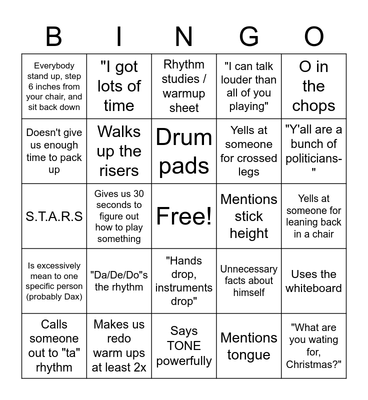 This bingo card has a free space and 35 words: Mentions LOVE SONG, Mentions PIRATE SONG, Threatens us with a warm-up test, Walks up the risers, "Hands drop, instruments drop", "I can talk louder than all of you playing", Doesn't give us enough time to pack up, Re-teaches percussion how to play, Drum pads, Checks everyone's stand height, S.T.A.R.S, O in the chops, Spends 10+ minutes on dynamics, Cuts the band off mid- measure, Everybody stand up, step 6 inches from your chair, and sit back down, Mentions stick height, Mentions tongue, Gives us 30 seconds to figure out how to play something, Is excessively mean to one specific person (probably Dax), "What are you wating for, Christmas?", Unnecessary facts about himself, Calls someone out to "ta" rhythm, Uses the whiteboard, Makes us redo warm ups at least 2x, Rhythm studies / warmup sheet, "Y'all are a bunch of politicians-", Feet flat on the floor, shoulder width apart, Makes brass point bells at him, Yells at someone for crossed legs, Yells at someone for leaning back in a chair, "Band is the most challenging class", Says TONE powerfully, "Da/De/Do"s the rhythm, "I got lots of time and Makes a specific person/section stand up to play.