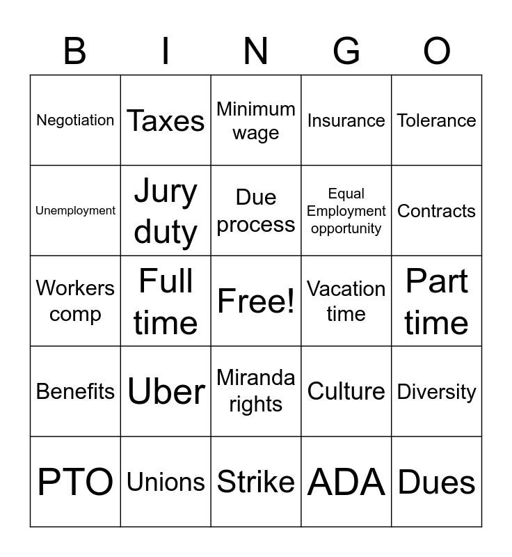 This bingo card has a free space and 28 words: Diversity, Acceptance, Equal Employment opportunity, ADA, Unemployment, Minimum wage, Taxes, Benefits, Vacation time, PTO, Workers comp, Insurance, Unions, Strike, Contracts, Shared economy, Uber, Jury duty, Due process, Miranda rights, Negotiation, Sick time, Dues, Full time, Part time, Culture, Tolerance and Burnout.