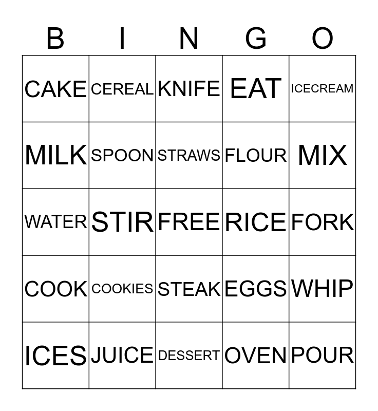 This bingo card has a free space and 24 words: COOKIES, JUICE, STRAWS, ICES, ICECREAM, CAKE, MILK, CEREAL, RICE, STEAK, FLOUR, WATER, EGGS, WHIP, SPOON, OVEN, FORK, KNIFE, MIX, STIR, POUR, COOK, EAT and DESSERT.