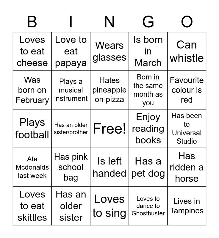 This bingo card has a free space and 24 words: Has pink school bag, Has an older sister, Hates pineapple on pizza, Loves to eat skittles, Can whistle, Loves to eat cheese, Was born on February, Love to eat papaya, Enjoy reading books, Is left handed, Born in the same month as you, Plays football, Has a pet dog, Has ridden a horse, Plays a musical instrument, Loves to dance to Ghostbuster, Has been to Universal Studio, Wears glasses, Favourite colour is red, Has an older sister/brother, Lives in Tampines, Ate Mcdonalds last week, Is born in March and Loves to sing.