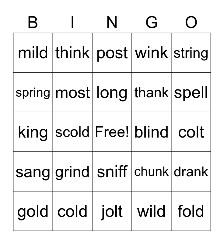 This bingo card has a free space and 29 words: gold, bold, scold, child, mild, post, most, grind, blind, cold, colt, fold, jolt, wild, spell, grass, sniff, sang, string, king, chunk, stamp, thank, spring, wink, think, drank, long and song.