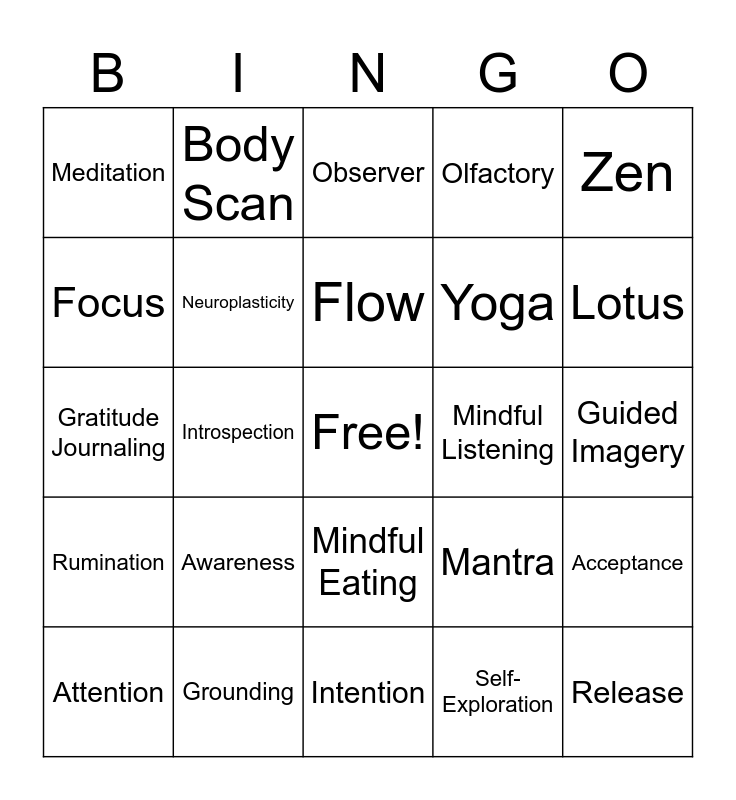 This bingo card has a free space and 24 words: Awareness, Grounding, Flow, Attention, Zen, Meditation, Focus, Body Scan, Mindful Listening, Mindful Eating, Yoga, Gratitude Journaling, Mantra, Acceptance, Neuroplasticity, Self-Exploration, Guided Imagery, Observer, Lotus, Introspection, Release, Rumination, Olfactory and Intention.