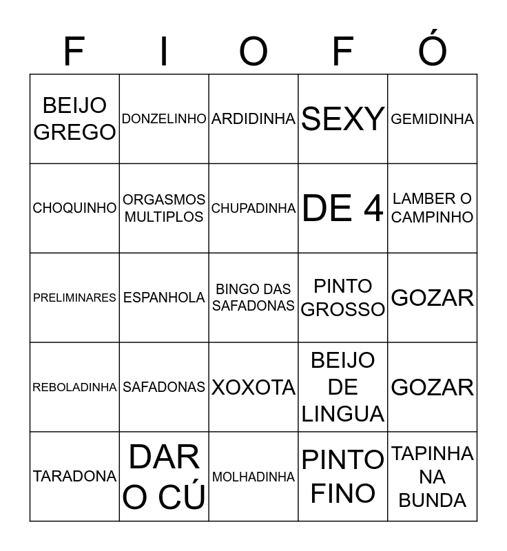 This bingo card has a free space and 24 words: SAFADONAS, DAR O CÚ, CHUPADINHA, TARADONA, GEMIDINHA, BEIJO GREGO, CHOQUINHO, DONZELINHO, PINTO GROSSO, XOXOTA, DE 4, PRELIMINARES, BEIJO DE LINGUA, GOZAR, ORGASMOS MULTIPLOS, PINTO FINO, GOZAR, ARDIDINHA, LAMBER O CAMPINHO, ESPANHOLA, TAPINHA NA BUNDA, REBOLADINHA, SEXY and MOLHADINHA.